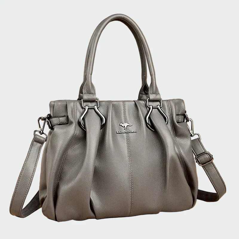 Elegant dameskultaske i sort nuance, med rillet lædertekstur og moderne design med folder foran. Den har dobbelt håndtag for en komfortabel greb og en aftagelig justerbar skulderrem, så den kan bæres over skulderen. Ideel til daglig brug, men også til mere elegante anledninger, der tilbyder praktisk og stil.